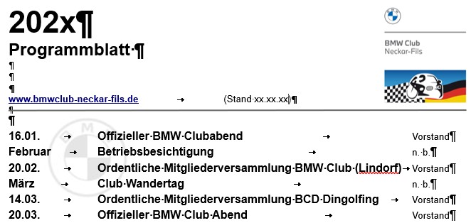 Nachfolgend der pdf-File als download: Jahresprogramm 2026 (Stand 27.02.2026) 2026_BMW Club Neckar-Fils Programmblatt